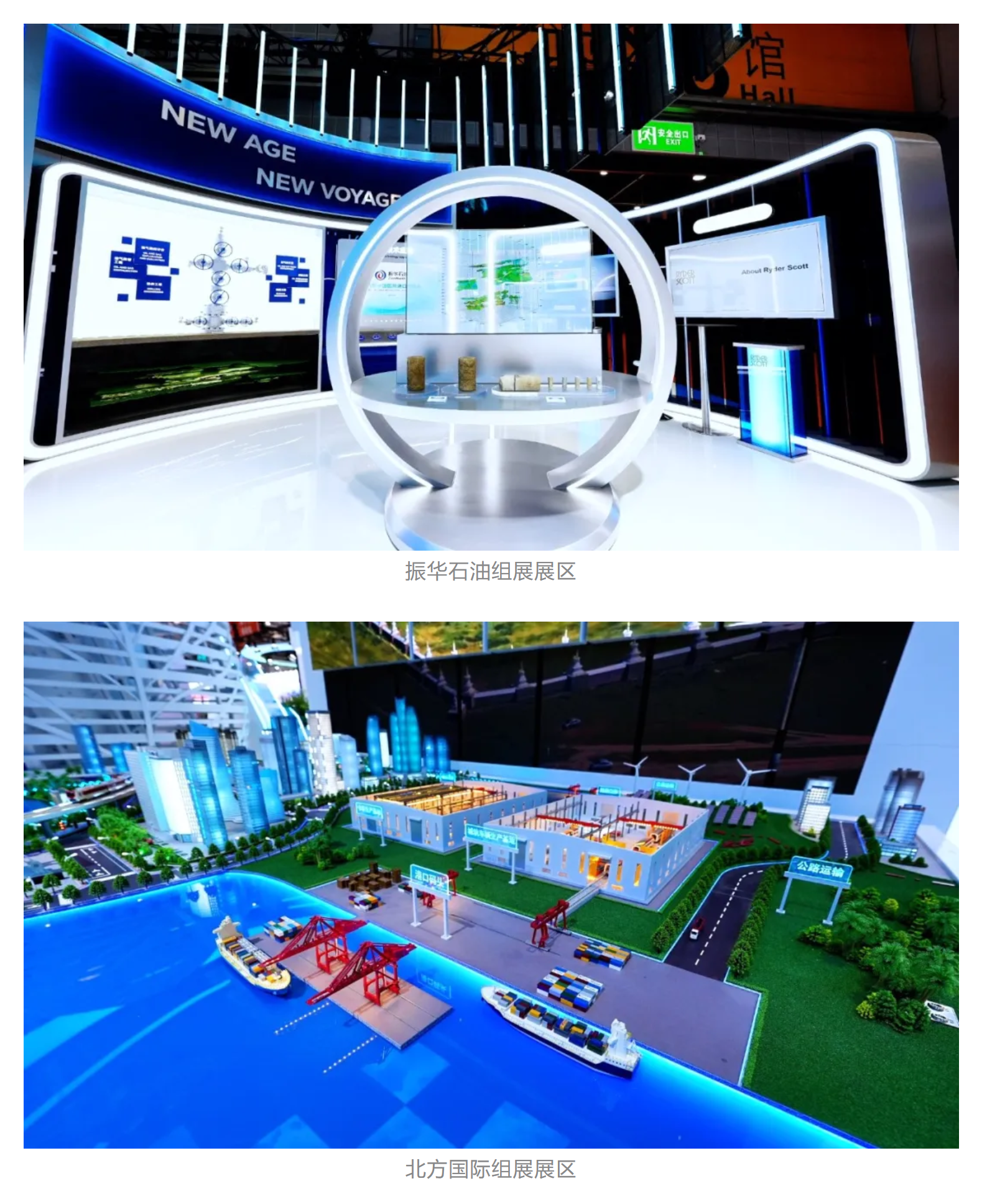 振華石油以“一滴油的故事”串聯(lián)起從勘探開(kāi)采到貿易服務(wù)的全產(chǎn)業(yè)鏈,揭示油氣勘探的地球密碼。北方礦業(yè)以《千里江山圖》為靈感,將綠色發(fā)展理念融入礦業(yè)開(kāi)發(fā),呈現“綠水青山就是金山銀山”的現代礦業(yè)新圖景。北方國際通過(guò)創(chuàng )新性的5D穹幕電影、UI互動(dòng)屏幕、2.5D墻上沙盤(pán)等手段,帶領(lǐng)觀(guān)眾全景感知電力、礦產(chǎn)、交通等領(lǐng)域一體化建設的豐碩成果。奧信公司以一體化服務(wù)模型,凸顯全流程自主可控的核心優(yōu)勢。